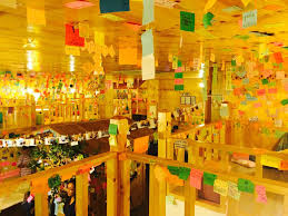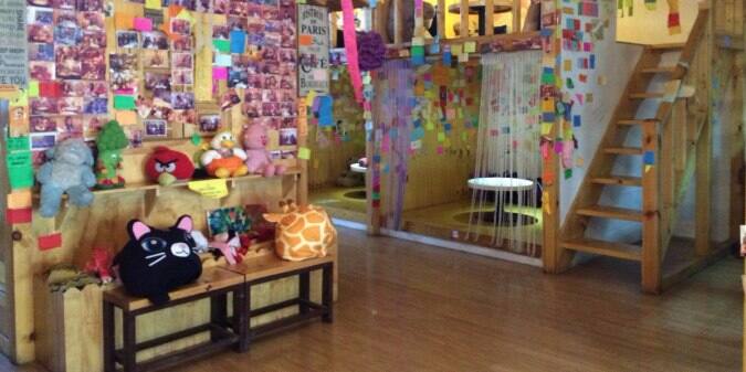 Cafe Namoo, which labels itself as a dessert cafe and bistro, is more for lounging around or hanging out with family and friends. Instead of tables and chairs, the cafe has sections separated by wooden partitions. Each square section is closed off on three sides and curtained on the remaining open side. Cushions are provided and guests, who have to sit on the wooden floor, can use them as back props or pillows if they want to lie down. There’s a low table where you can put your food and drinks. There are sections with a top tier, like bunk beds. The top areas are accessible through wooden stairways. You can bring post-it notes, write inspirational words on them and paste them on the walls.